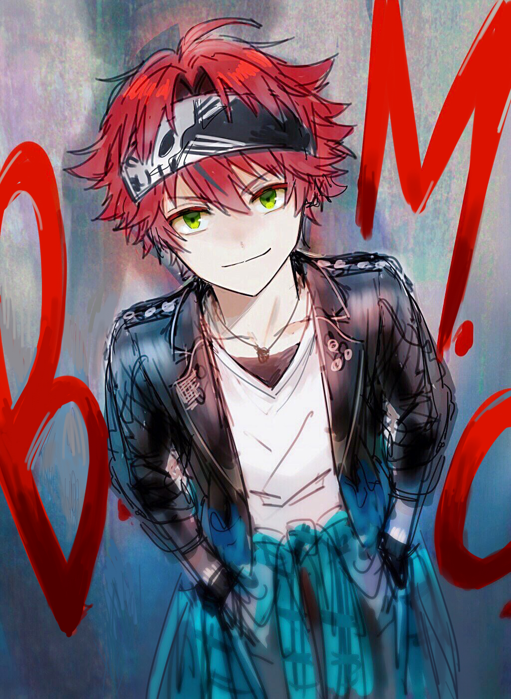 1boy black_jacket closed_mouth dankira!!! green_eyes highres jacket leather leather_jacket long_sleeves looking_at_viewer male_focus red_hair short_hair smirk solo tsubaki_kento yukinotihare
