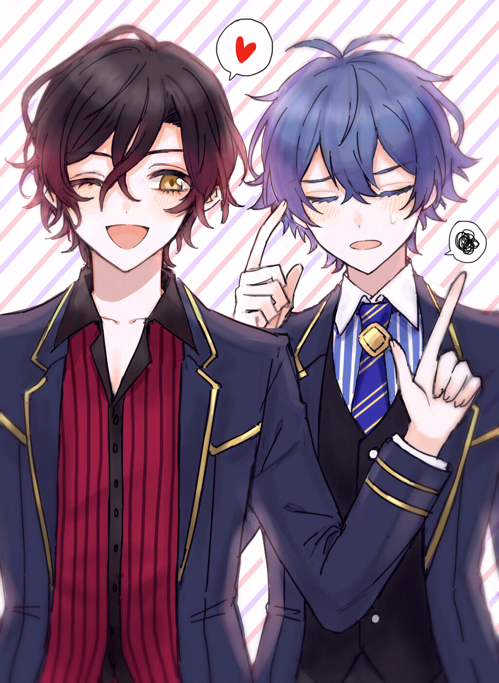 2boys blue_hair blush brown_hair closed_eyes dankira!!! heart highres kagemiya_kei male_focus multicolored_hair multiple_boys open_mouth red_hair short_hair smile yagami_soma yellow_eyes yukinotihare