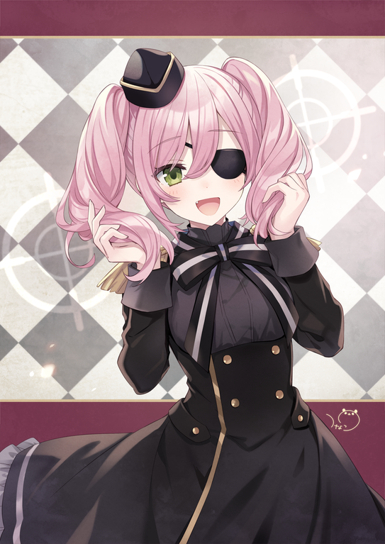 1girl :d annette_(spy_kyoushitsu) black_bow black_bowtie black_dress bow bowtie dress eyepatch fang green_eyes hat holding holding_own_hair mini_hat official_art open_mouth pink_hair second-party_source smile solo spy_kyoushitsu tsunako twintails white_bow white_bowtie