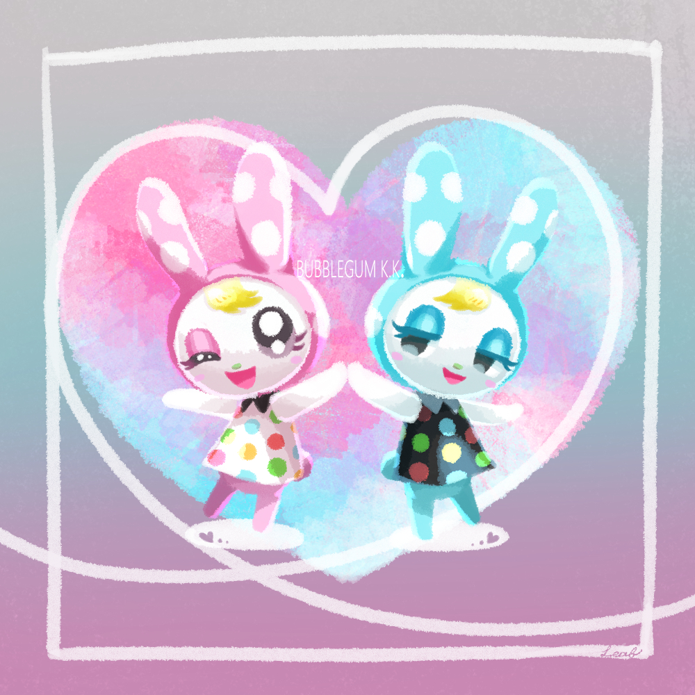 2girls animal_crossing animal_nose arms_up artist_name black_dress black_eyes blonde_hair blue_eyeshadow blue_fur body_fur border chrissy_(animal_crossing) collared_dress derivative_work dress english_text eyeshadow female_focus flat_chest francine_(animal_crossing) furry furry_female half-closed_eyes happy heart heart_background holding_hands leaf_(pixiv17652941) looking_at_another looking_at_viewer looking_to_the_side makeup multiple_girls nintendo one_eye_closed open_mouth outstretched_arms pink_fur polka_dot polka_dot_dress rabbit_ears rabbit_girl rabbit_tail short_dress short_hair siblings signature sisters sleeveless sleeveless_dress smile standing standing_on_one_leg swept_bangs symmetry two-tone_fur white_border white_dress white_fur wide-eyed wink