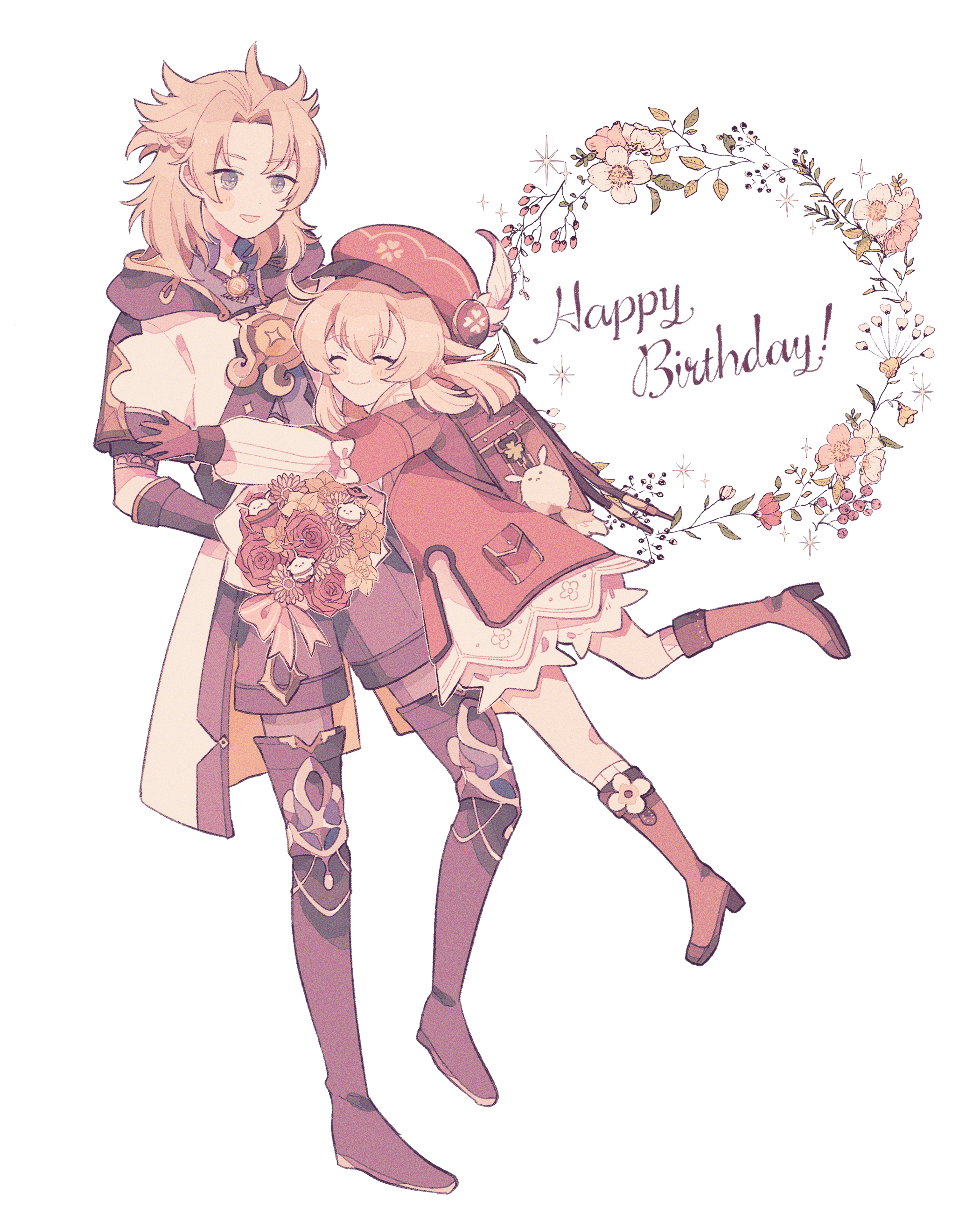 1boy 1girl :d absurdres ahoge albedo_(genshin_impact) backpack bag black_footwear black_gloves black_shorts blonde_hair bloomers blush boots bouquet bow brown_bag brown_footwear newsboy_cap child closed_eyes clover commentary_request dodoco_(genshin_impact) dress elbow_gloves english_text flower flower_wreath full_body genshin_impact gloves grey_eyes hair_between_eyes happy_birthday hat hat_feather height_difference highres holding holding_bouquet hood hooded_coat hug jumping klee_(genshin_impact) knee_boots leg_up long_sleeves looking_at_another medium_hair messy_hair open_mouth parted_hair pointy_ears randoseru red_dress red_headwear ririco_(gnsn) rose short_hair short_sleeves shorts sidelocks simple_background smile standing twintails underwear white_background white_bow