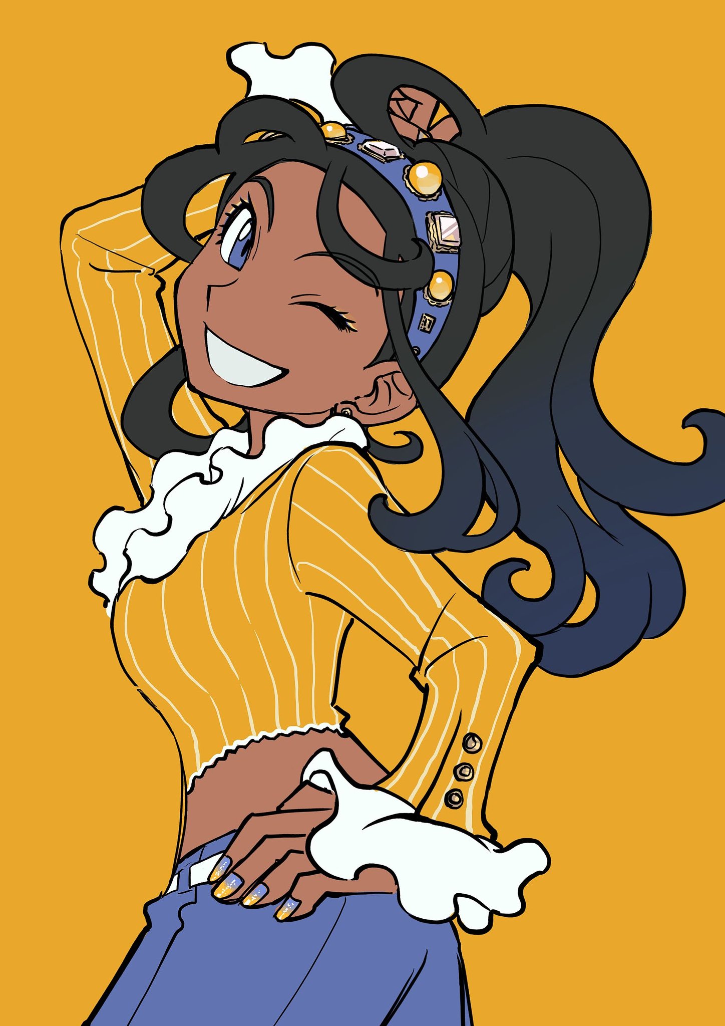 1girl arm_behind_head belt black_hair blue_eyes buttons commentary cropped_shirt curly_hair dahlia_(pokemon) earrings elizabeth_(tomas21) eyelashes eyeshadow flat_color frills from_side grey_pants grin hand_on_own_hip hand_up head_tilt high_ponytail highres jewelry long_sleeves looking_at_viewer makeup nail_polish nintendo one_eye_closed orange_background orange_shirt pants pokemon pokemon_diamond/pearl/platinum pokemon_platinum ponytail shirt simple_background smile solo striped_clothes striped_shirt vertical-striped_clothes vertical-striped_shirt white_belt yellow_eyeshadow