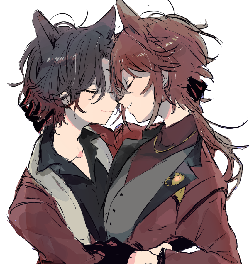 2boys animal_ears black_shirt black_vest blush brown_hair cat_boy cat_ears closed_eyes collared_shirt dankira!!! formal_clothes gloves jewelry long_hair long_sleeves matching_outfits multiple_boys necklace red_hair red_shirt shirt short_hair sneezecoon tsubaki_seito turtleneck vest yagami_soma yaoi