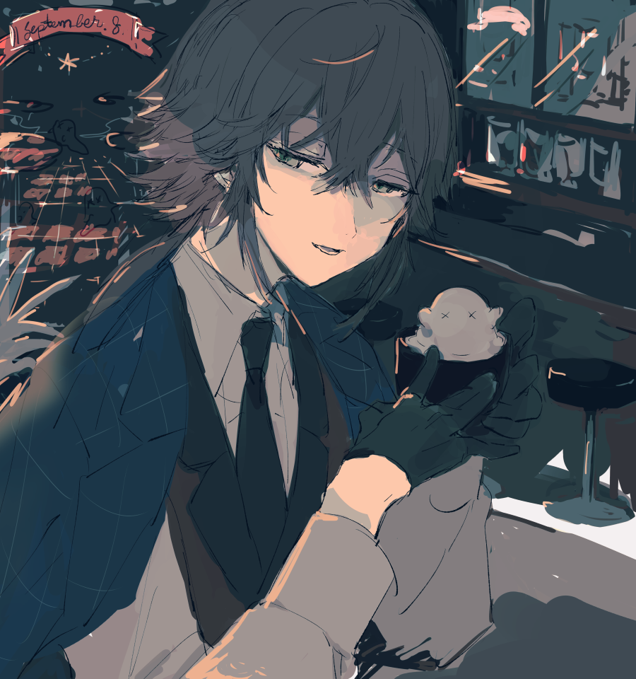 1boy black_necktie brown_hair brown_vest collared_shirt cup dankira!!! dated facing_viewer gloves grey_eyes holding holding_cup jacket long_hair looking_to_the_side male_focus mug necktie open_mouth plaid_clothes plaid_jacket shirt sketch sneezecoon solo tsubaki_seito vest white_shirt