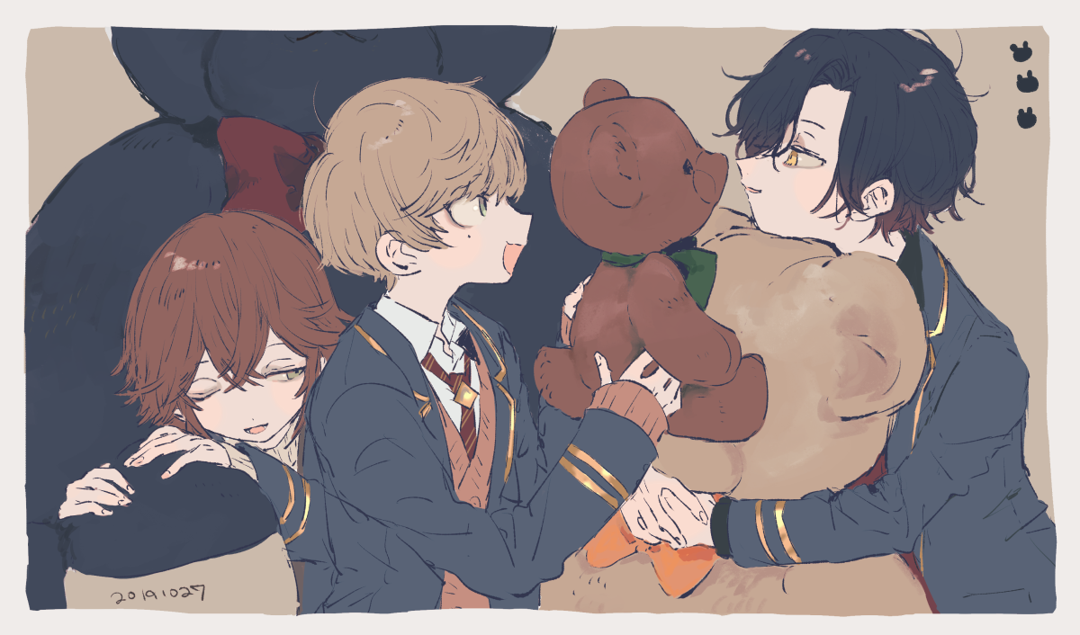 3boys black_hair dankira!!! green_eyes light_brown_hair long_hair male_focus miki_nozomu mole mole_under_eye multicolored_hair multiple_boys one_eye_closed red_hair short_hair sneezecoon stuffed_animal stuffed_toy teddy_bear theater_bell_(dankira!!!) tsubaki_seito yagami_soma yellow_eyes