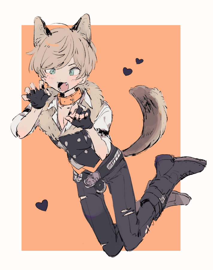 1boy animal_ears blush border collar dankira!!! dog_boy dog_ears dog_tail fang full_body green_eyes light_brown_hair looking_at_viewer male_focus miki_nozomu mole mole_under_eye open_mouth orange_background short_hair sketch sneezecoon solo tail white_border