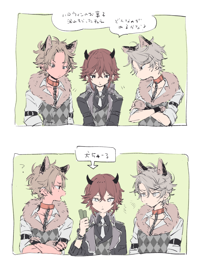 3boys blonde_hair busujima_tsukumo collar comic dankira!!! dark-skinned_male dark_skin demon_boy green_eyes grey_hair habashiri_ginko halloween male_focus multiple_boys red_hair sketch sneezecoon translation_request tsubaki_seito white_background yellow_eyes