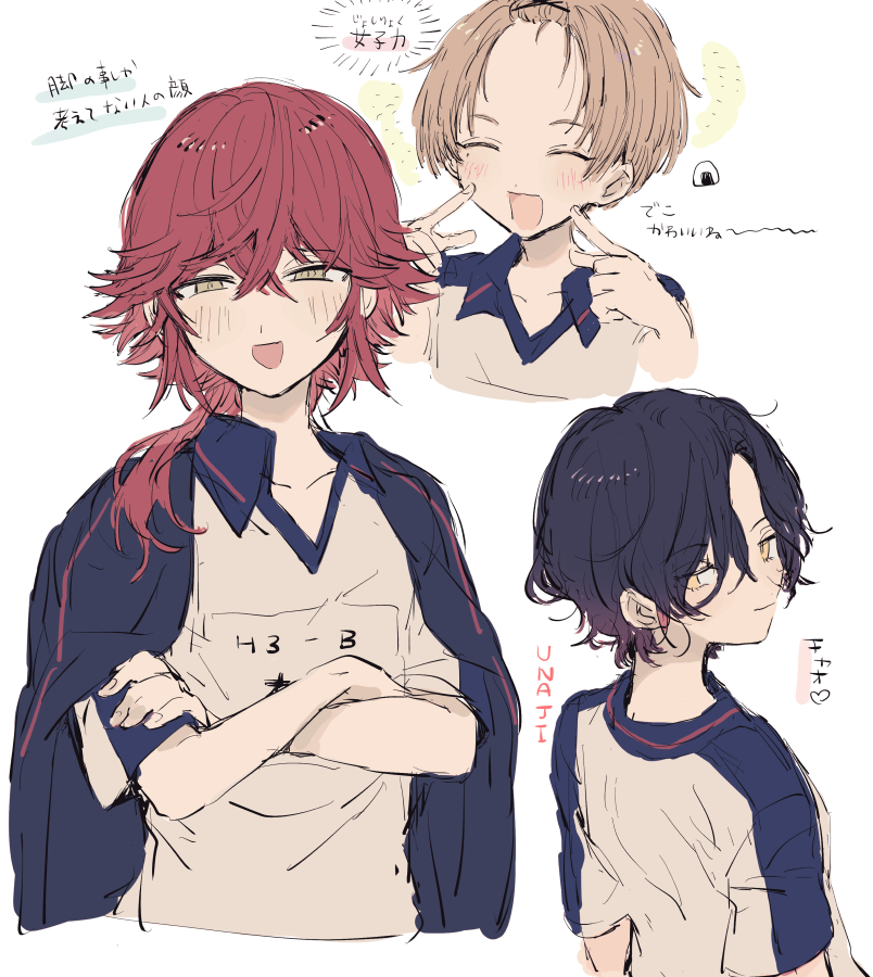 3boys black_hair dankira!!! green_eyes long_hair looking_at_viewer male_focus miki_nozomu mole mole_under_eye multicolored_hair multiple_boys red_hair short_hair sketch sneezecoon translation_request tsubaki_seito white_background yagami_soma yellow_eyes