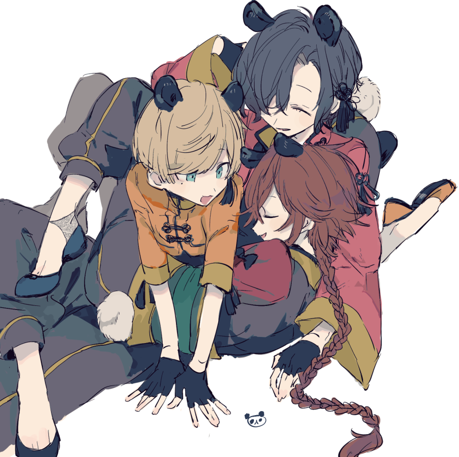 3boys black_hair blonde_hair closed_eyes dankira!!! green_eyes long_braid long_hair miki_nozomu mole mole_under_eye multiple_boys open_mouth red_hair short_hair sketch smile sneezecoon theater_bell_(dankira!!!) tsubaki_seito white_background yagami_soma