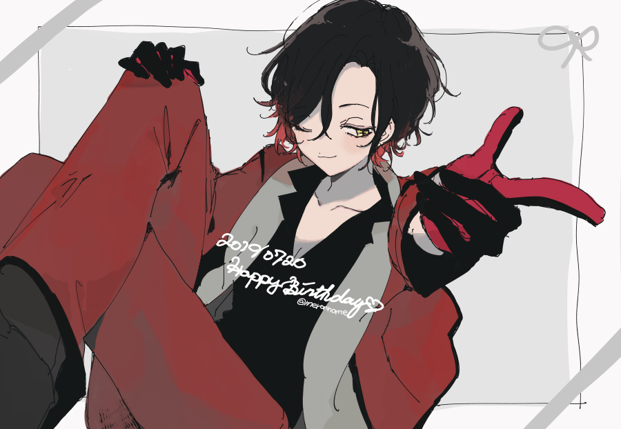 1boy black_hair black_shirt collared_shirt dankira!!! formal_clothes gloves long_sleeves looking_at_viewer male_focus multicolored_hair one_eye_closed pants red_hair red_suit shirt short_hair sketch sneezecoon solo suit yagami_soma yellow_eyes