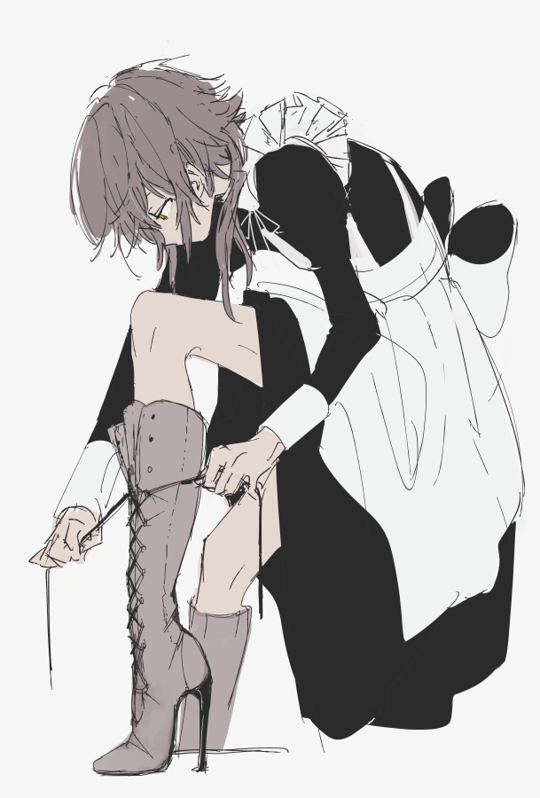 1boy androgynous apron boots brown_hair crossdressing crossdressing_(mtf) dankira!!! green_eyes high_heel_boots high_heels long_hair maid maid_apron male_focus male_maid sketch sneezecoon solo stiletto_heels tsubaki_seito tying_footwear white_background