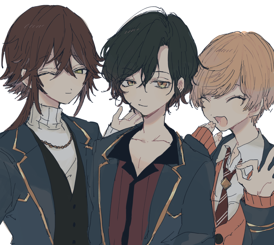 3boys black_hair blonde_hair closed_eyes dankira!!! green_eyes long_hair looking_at_viewer miki_nozomu multicolored_hair multiple_boys one_eye_closed red_hair short_hair sketch sneezecoon solo theater_bell_(dankira!!!) tsubaki_seito white_background yagami_soma yellow_eyes
