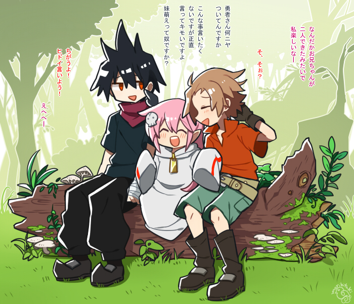 1girl 2boys alba_(senyuu) blush brown_hair closed_eyes hair_ornament long_hair long_sleeves multiple_boys mushroom pink_hair pointy_ears red_eyes ross_(senyuu) ruki_(senyuu) ryokoubato sen'yuu. shorts sitting skull_hair_ornament translation_request tree
