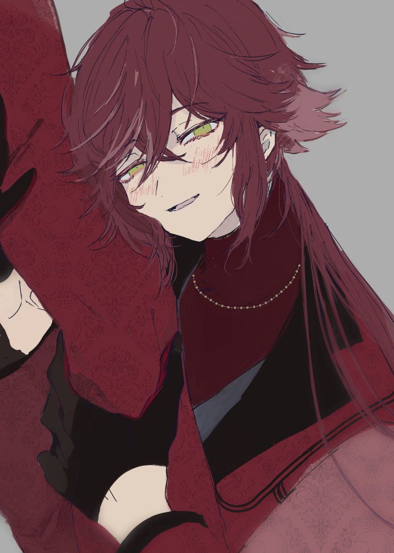 1boy 1other blush dankira!!! gloves gold_necklace green_eyes jewelry long_hair long_sleeves looking_at_viewer male_focus necklace red_hair red_sweater sketch smile sneezecoon sweater teeth tsubaki_seito turtleneck turtleneck_sweater