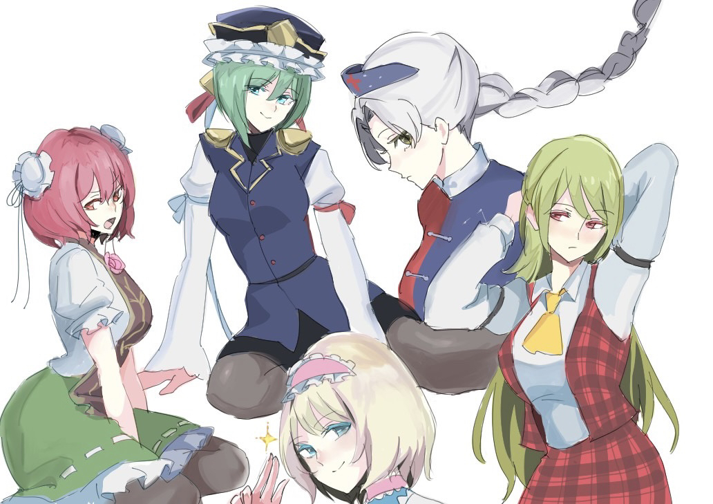 5girls alice_margatroid arms_behind_head ascot black_pantyhose black_skirt blonde_hair blue_eyes blue_headwear blue_vest braid braided_ponytail bun_cover closed_mouth constellation_print cross double_bun epaulettes flower frilled_hairband frilled_hat frills green_eyes green_hair green_skirt grey_eyes grey_hair hair_bun hairband hat ibaraki_kasen kazami_yuuka long_hair looking_at_viewer multiple_girls nurse_cap open_mouth pantyhose pink_flower pink_hair pink_rose plaid_clothes plaid_skirt plaid_vest red_cross red_eyes red_hairband red_skirt red_vest ribbon-trimmed_skirt ribbon_trim rose seiza shiki_eiki shirt short_hair short_sleeves simple_background sitting skirt smile star_(symbol) tabard tohoyuukarin touhou trigram vest white_background white_shirt yagokoro_eirin yellow_ascot yokozuwari