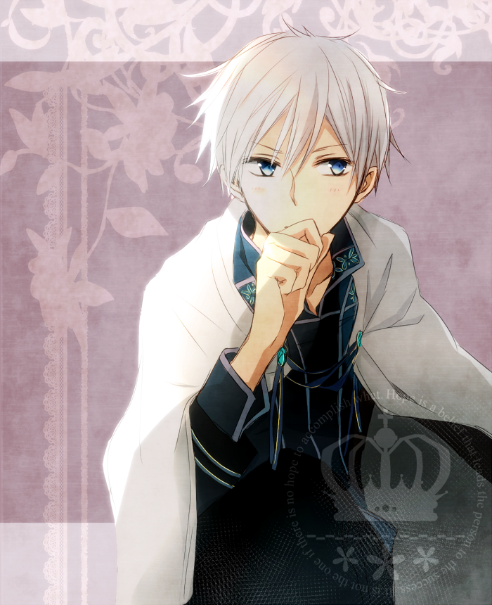 1boy akagami_no_shirayukihime blue_eyes cape commentary_request hair_between_eyes hand_to_own_mouth high_collar light_blush long_sleeves looking_to_the_side male_focus official_style partial_commentary short_hair sideways_glance solo tsukimori_usako white_cape white_hair zen_wistalia