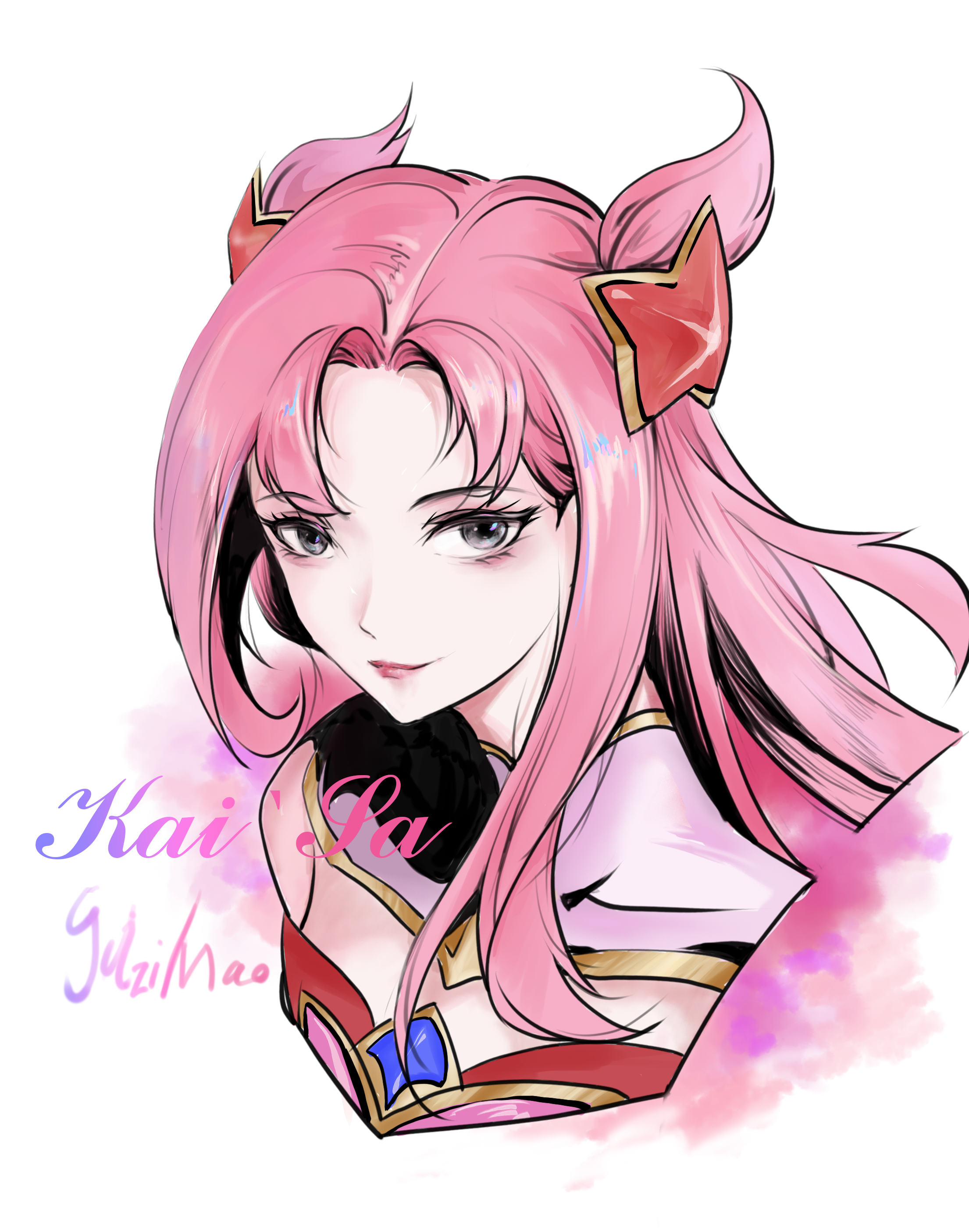 1girl absurdres artist_name character_name cropped_shoulders double_bun hair_bun hair_ornament highres juzi_mao kai'sa league_of_legends long_hair parted_bangs pink_eyes pink_lips smile solo star_(symbol) star_guardian_(league_of_legends) star_guardian_kai'sa star_hair_ornament white_background