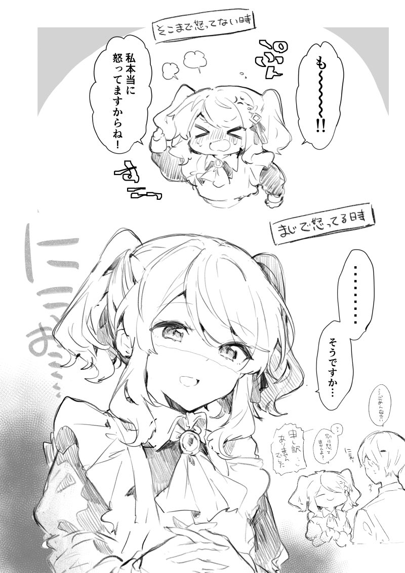 >_< 1boy 1girl apron ascot blush brooch hand_up ikeuchi_tanuma jewelry leuk_(ikeuchi_tanuma) looking_at_viewer maid_apron open_mouth original shirt sidelocks smile tino_(ikeuchi_tanuma) translation_request twintails