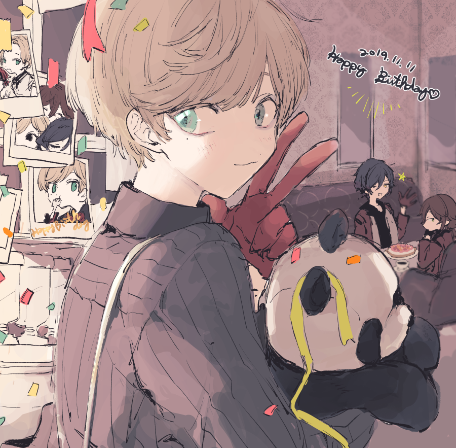 3boys black_shirt blonde_hair brown_hair dankira!!! dated gloves green_eyes happy_birthday holding holding_stuffed_toy long_hair long_sleeves looking_at_viewer male_focus miki_nozomu mole mole_under_eye multiple_boys photo_(object) red_hair shirt short_hair sketch sneezecoon stuffed_animal stuffed_panda stuffed_toy suspenders theater_bell_(dankira!!!) tsubaki_seito yagami_soma yellow_eyes