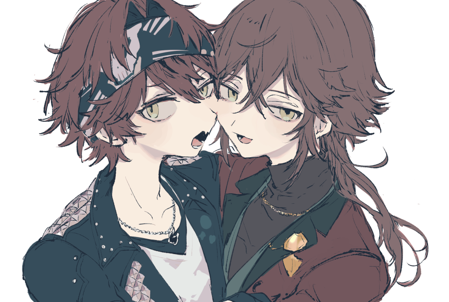 2boys blazer brothers dankira!!! green_eyes hug jacket leather leather_jacket long_hair looking_at_viewer male_focus multiple_boys open_mouth red_hair red_sweater scowl short_hair siblings smile sneezecoon sweater tsubaki_kento tsubaki_seito turtleneck turtleneck_sweater white_background