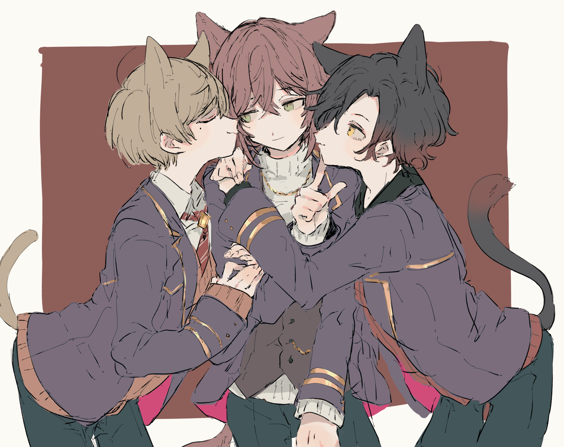 3boys animal_ears black_hair border cat_boy cat_ears cat_tail closed_eyes dankira!!! facing_another facing_viewer green_eyes highres long_hair looking_at_another looking_to_the_side male_focus miki_nozomu mole mole_under_eye multicolored_hair multiple_boys red_background red_hair short_hair sneezecoon tail tsubaki_seito white_border yagami_soma yellow_eyes