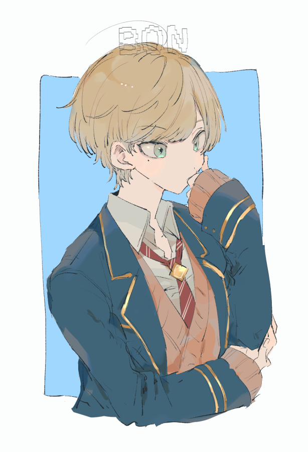 1boy ahoge aqua_background blazer blonde_hair blue_jacket border collared_shirt dankira!!! green_eyes jacket male_focus miki_nozomu mole mole_under_eye necktie school_uniform shirt short_hair sneezecoon solo vest white_border