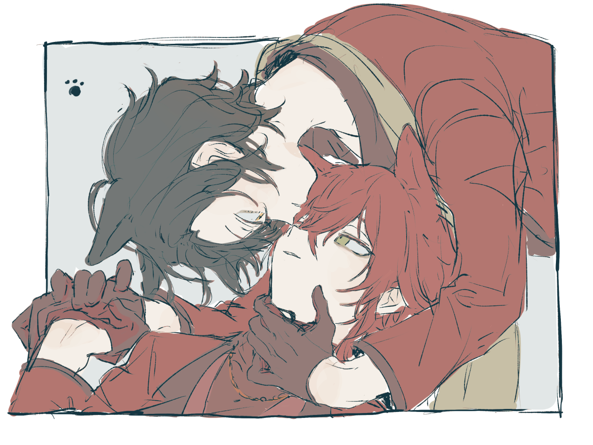 2boys animal_ears border brown_hair cat_boy cat_ears dankira!!! green_eyes grey_background looking_at_another looking_down looking_up male_focus multiple_boys red_hair sketch sneezecoon tsubaki_seito white_border yagami_soma yaoi yellow_eyes