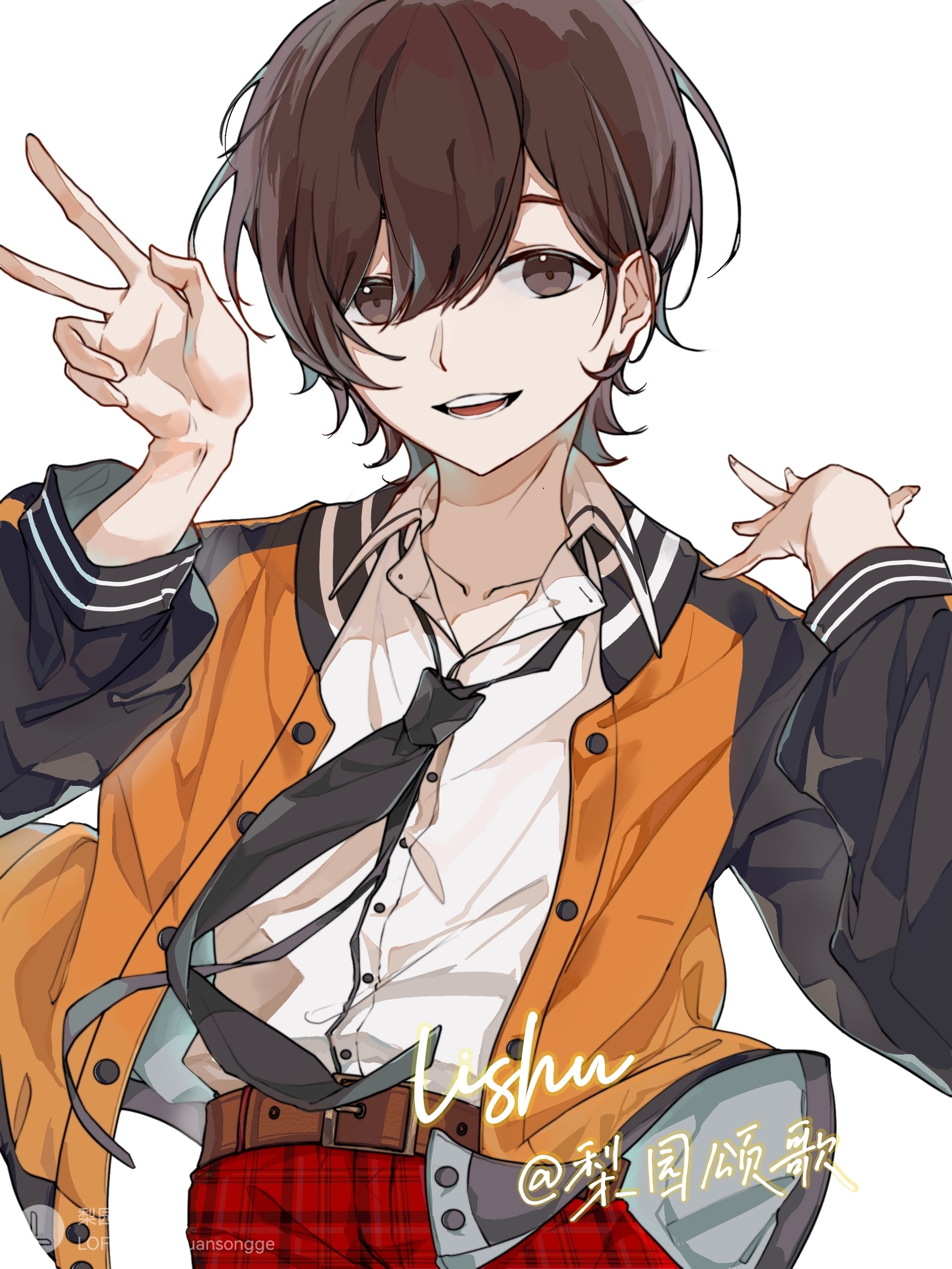 1boy 27-day aoppella belt brown_eyes brown_hair collared_shirt highres jacket long_sleeves looking_at_viewer male_focus necktie open_mouth orange_jacket pants plaid_clothes plaid_pants shirt short_hair signature smile solo suzumiya_hajime teeth v white_background white_shirt