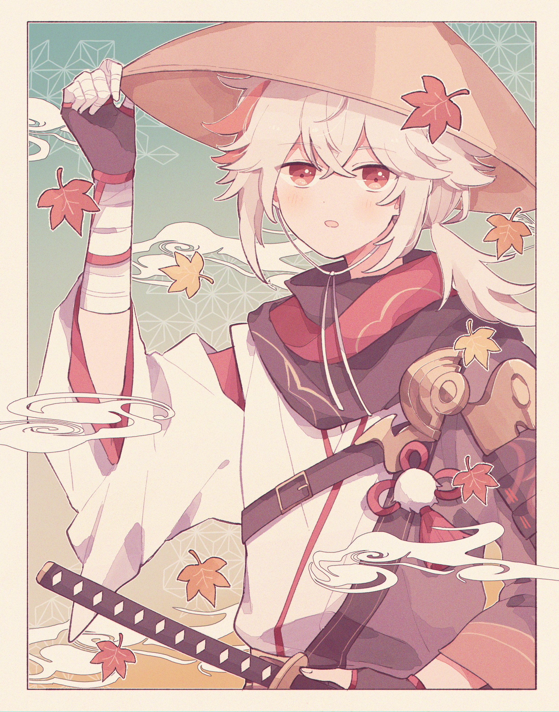 1boy :o absurdres arm_up asa_no_ha_(pattern) autumn_leaves bandaged_hand bandages black_border black_gloves border commentary_request crossed_bangs fingerless_gloves genshin_impact gloves gradient_background grey_hair hair_between_eyes hakama hat hexagon highres holding holding_sword holding_unworn_clothes holding_unworn_hat holding_weapon japanese_clothes kaedehara_kazuha katana kikkoumon leaf light_blush looking_at_viewer male_focus medium_hair multicolored_hair open_mouth ponytail red_eyes red_hair red_scarf rice_hat ririco_(gnsn) scarf short_ponytail sidelocks solo streaked_hair sword unworn_hat unworn_headwear upper_body weapon white_border white_hakama wide_sleeves
