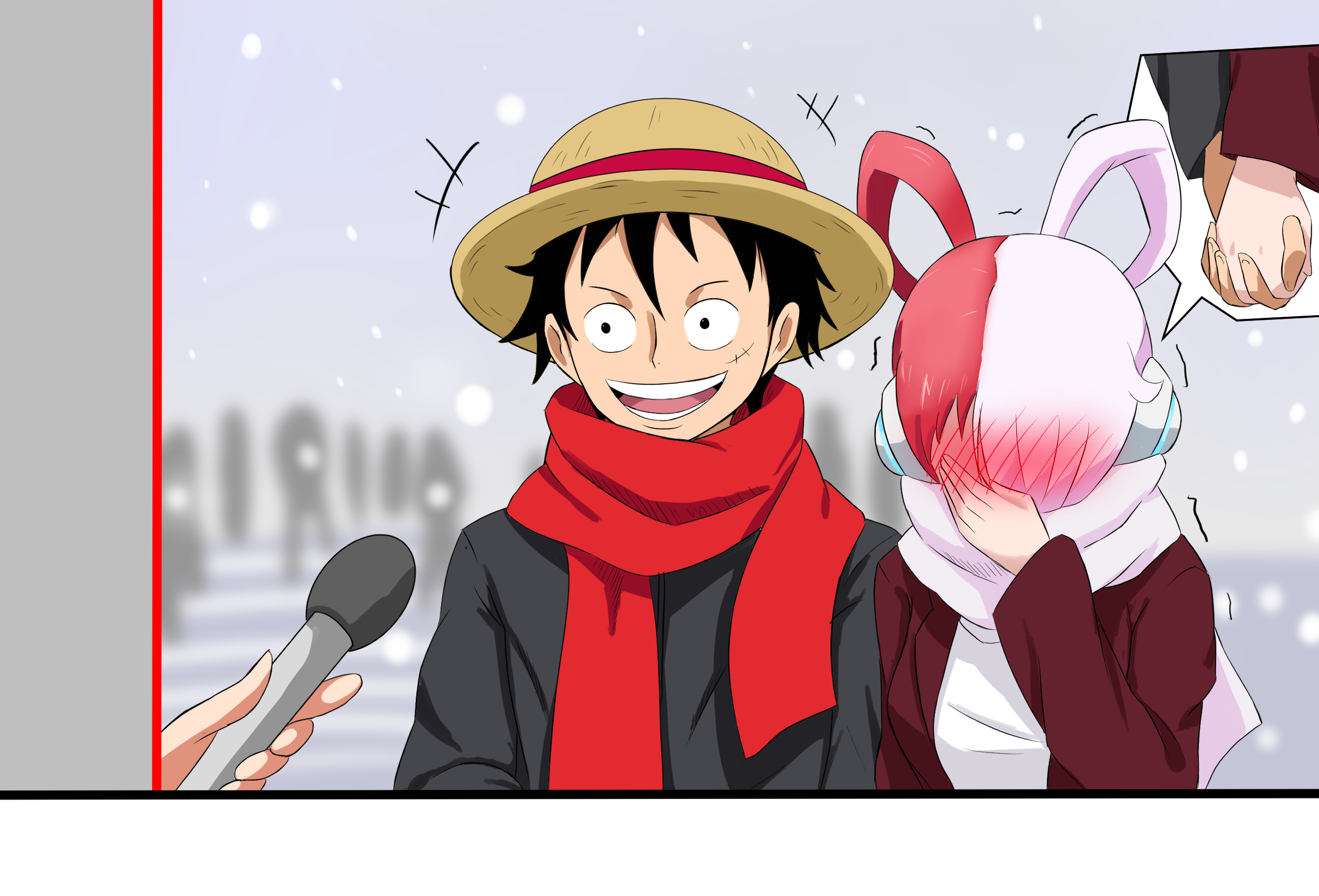 1boy black_hair blush grey_shirt hand_grab hat headphones highres long_sleeves meme monkey_d._luffy multicolored_hair news one_piece one_piece_film:_red parody red_hair red_scarf scarf shirt special_feeling_(meme) two-tone_hair uta_(one_piece) white_hair zerokun135