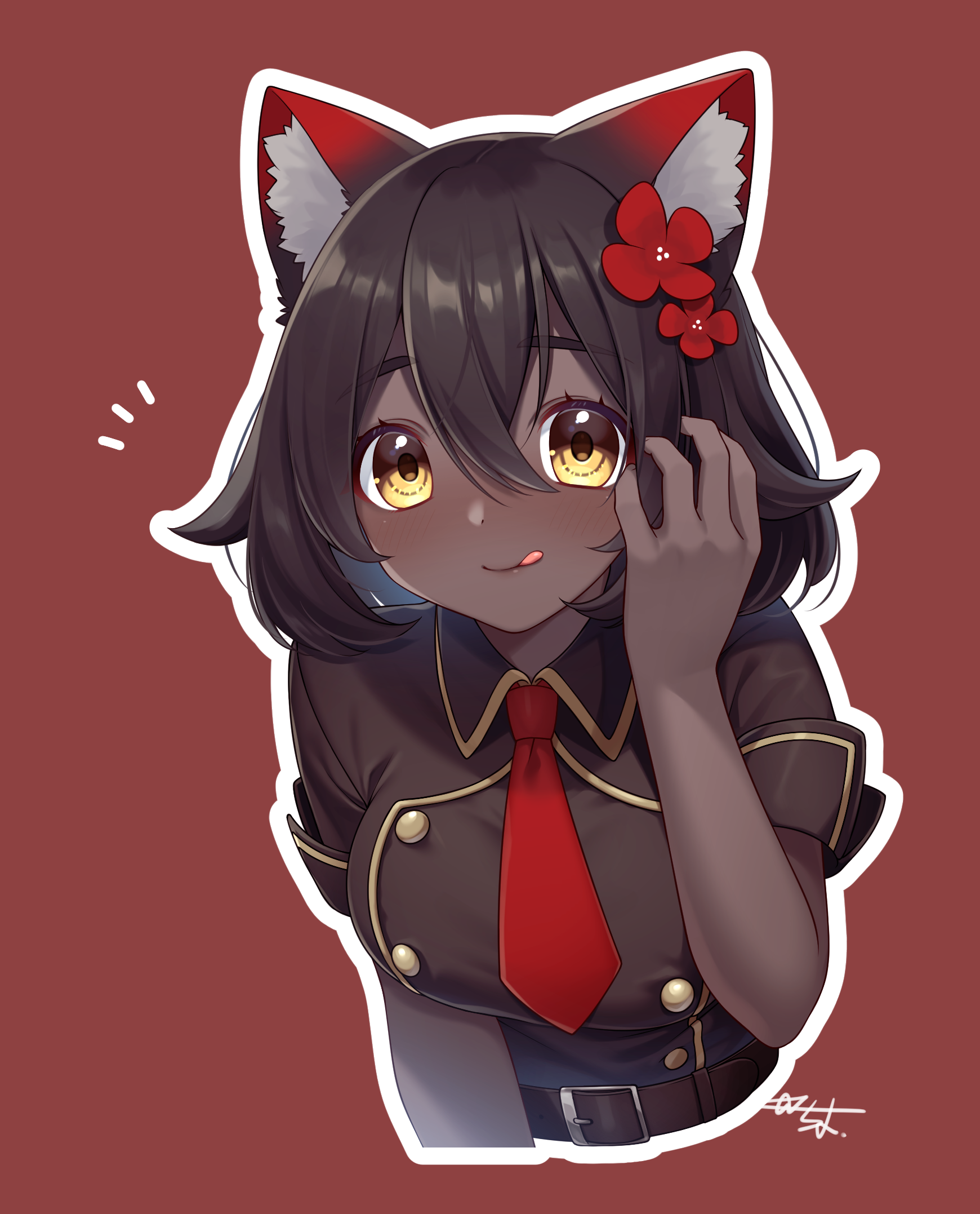1girl :q animal_ear_fluff animal_ears belt black_hair blush brown_background brown_belt commentary cropped_torso dark-skinned_female dark_skin flower food hair_flower hair_ornament hand_in_own_hair hand_up highres indie_virtual_youtuber leaning_forward looking_at_viewer mouth_hold necktie notice_lines original outline pocky_day red_flower red_necktie sakura_chiyo_(konachi000) sakuraba_chiyo short_hair short_sleeves signature simple_background solo sweatdrop tongue tongue_out translated upper_body very_dark_skin virtual_youtuber white_outline wing_collar yellow_eyes