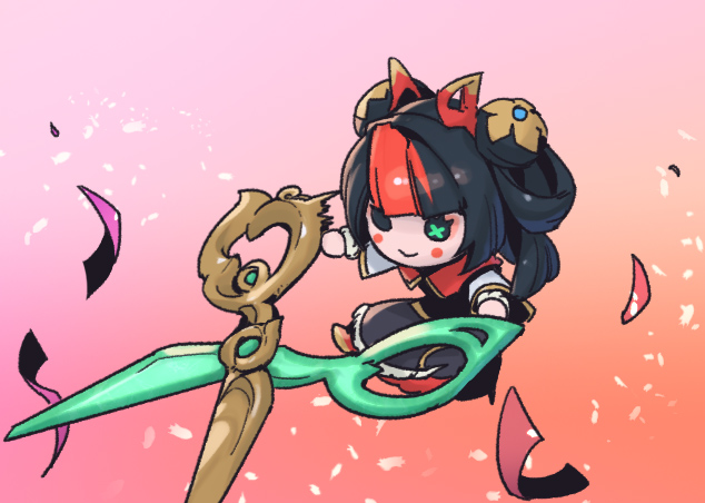 1girl black_dress black_eyes black_hair blush_stickers character_doll doll double_bun dress gwen_(league_of_legends) hair_bun hair_ornament holding holding_scissors league_of_legends multicolored_background multicolored_hair mythmaker_gwen phantom_cross red_hair scissors short_sleeves solo streaked_hair two-tone_hair