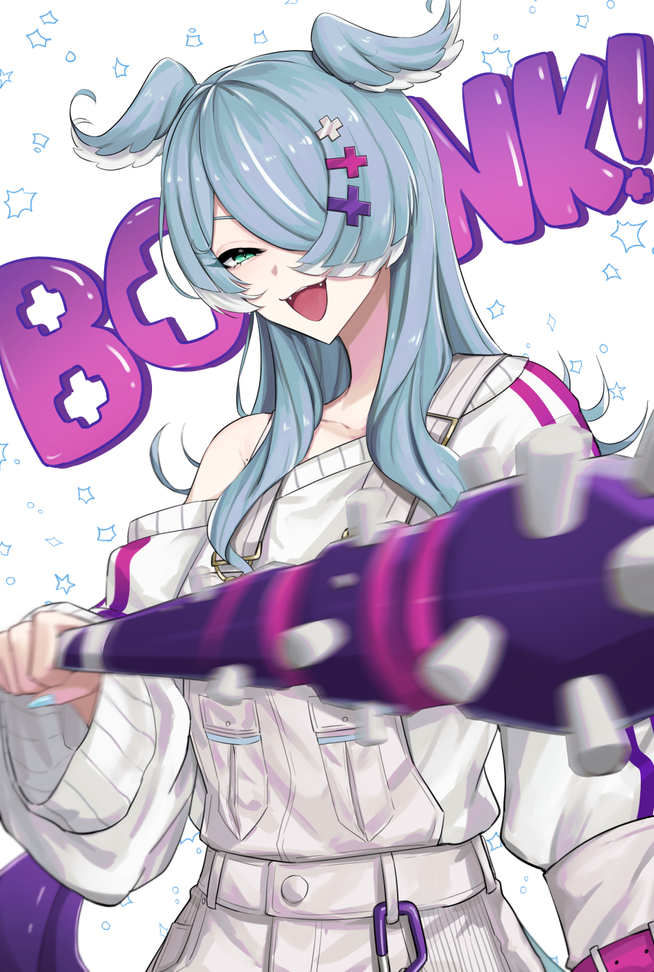 1girl :d aqua_eyes baseball_bat blue_hair elira_pendora elira_pendora_(1st_costume) fangs hair_ornament hair_over_one_eye hairclip head_wings highres long_hair mole mole_on_armpit nijisanji nijisanji_en off_shoulder open_mouth overalls ruuto_(ruto3) smile solo spiked_bat sweater virtual_youtuber wings