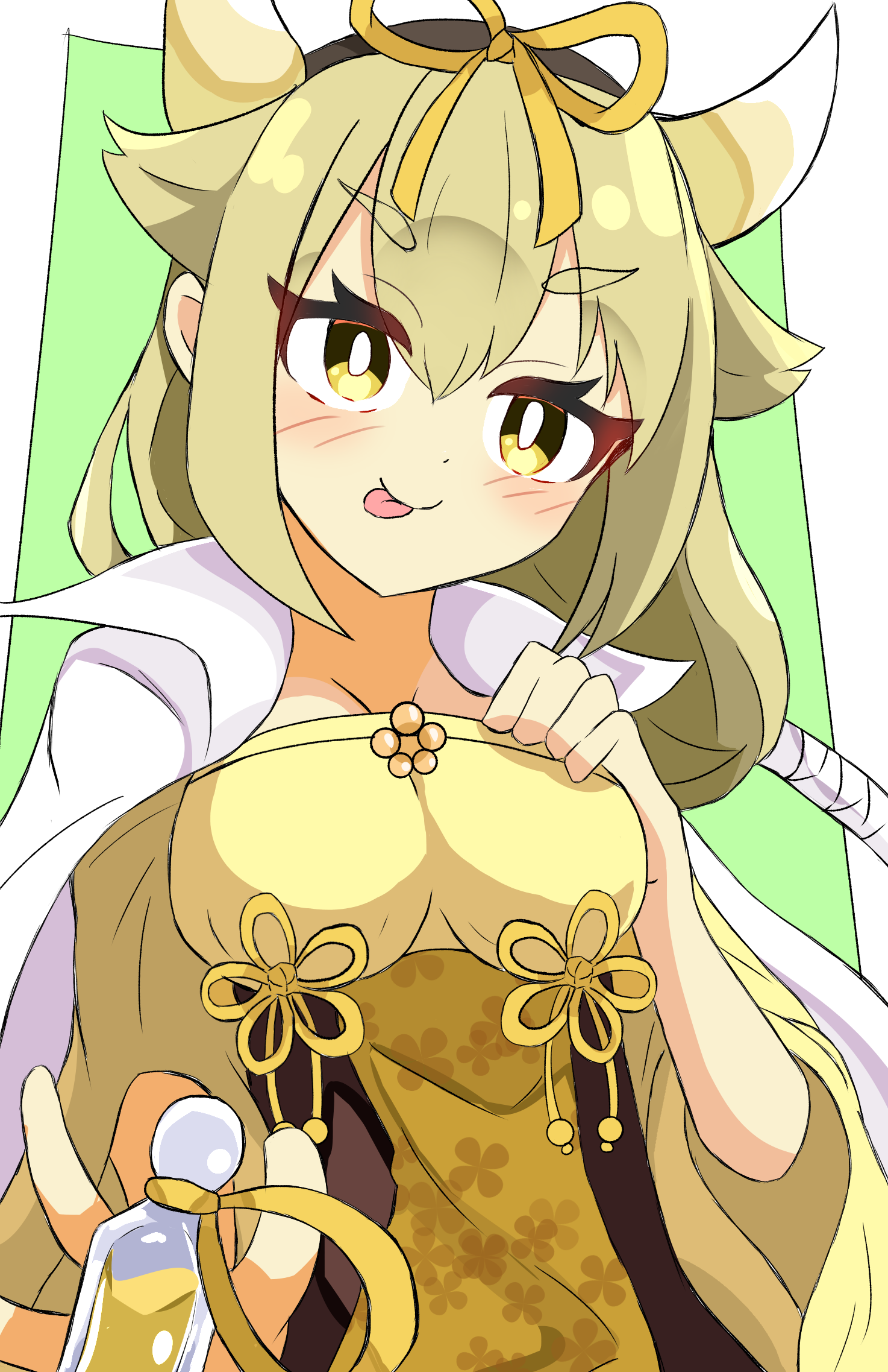 1girl akkunz blonde_hair bottle cape cow_horns goou_yoshimitsu hair_ribbon hairband highres horns long_hair potion ribbon tenka_hyakken thick_eyebrows tongue tongue_out wide_sleeves yellow_eyes