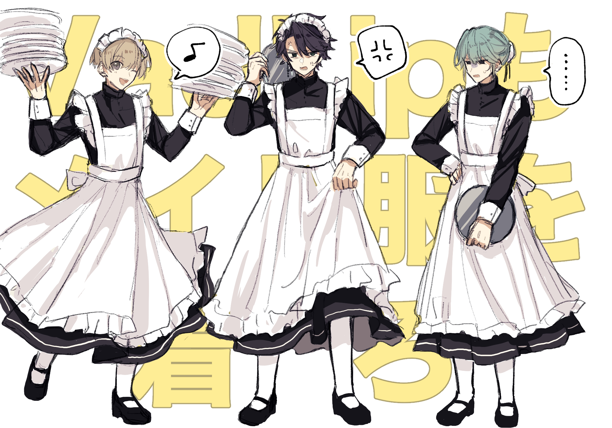 3boys aoppella apron black_eyes black_hair blue_hair brown_eyes crossdressing crossdressing_(mtf) fukisako_sunao full_body harumiya_hisaomi highres light_brown_hair looking_at_viewer maid maid_apron maid_headdress male_maid multiple_boys one_eye_closed osato_honami short_hair sketch uota_(plus_3-do-c)