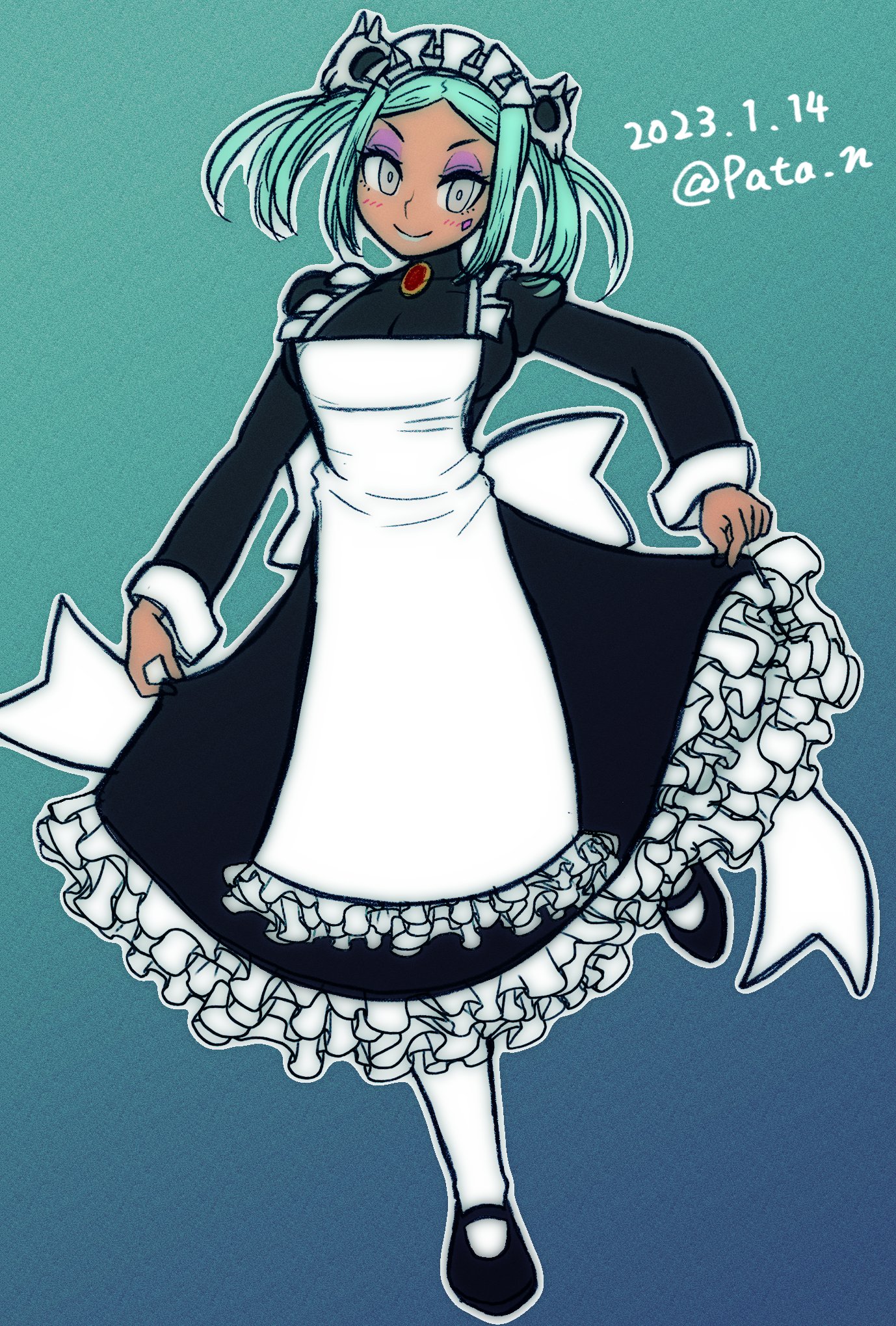 1girl alternate_costume apron bloody_marie_(skullgirls) bloody_marie_(skullgirls)_(cosplay) blue_background blush breasts brooch cerebella_(skullgirls) clothes_lift cosplay dark-skinned_female dark_skin dress dress_lift eyeshadow frilled_apron frilled_dress frills full_body green_hair green_lips hair_ornament highres jewelry large_breasts maid maid_headdress makeup mary_janes pantyhose pata_n shoes skull_hair_ornament skullgirls smile solo twintails