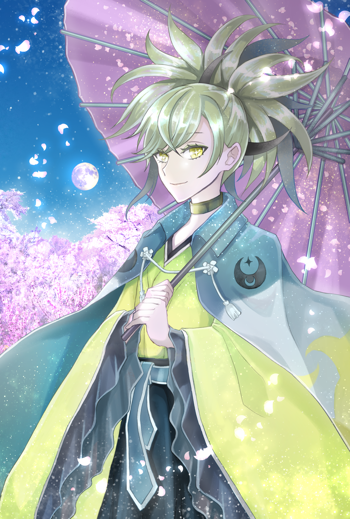 1boy ayaan_(ayako) black_hair character_name cherry_blossoms choker full_moon highres moon multicolored_hair oil-paper_umbrella outdoors petals smile solo standing technoroid two-tone_hair umbrella wide_sleeves yellow_eyes