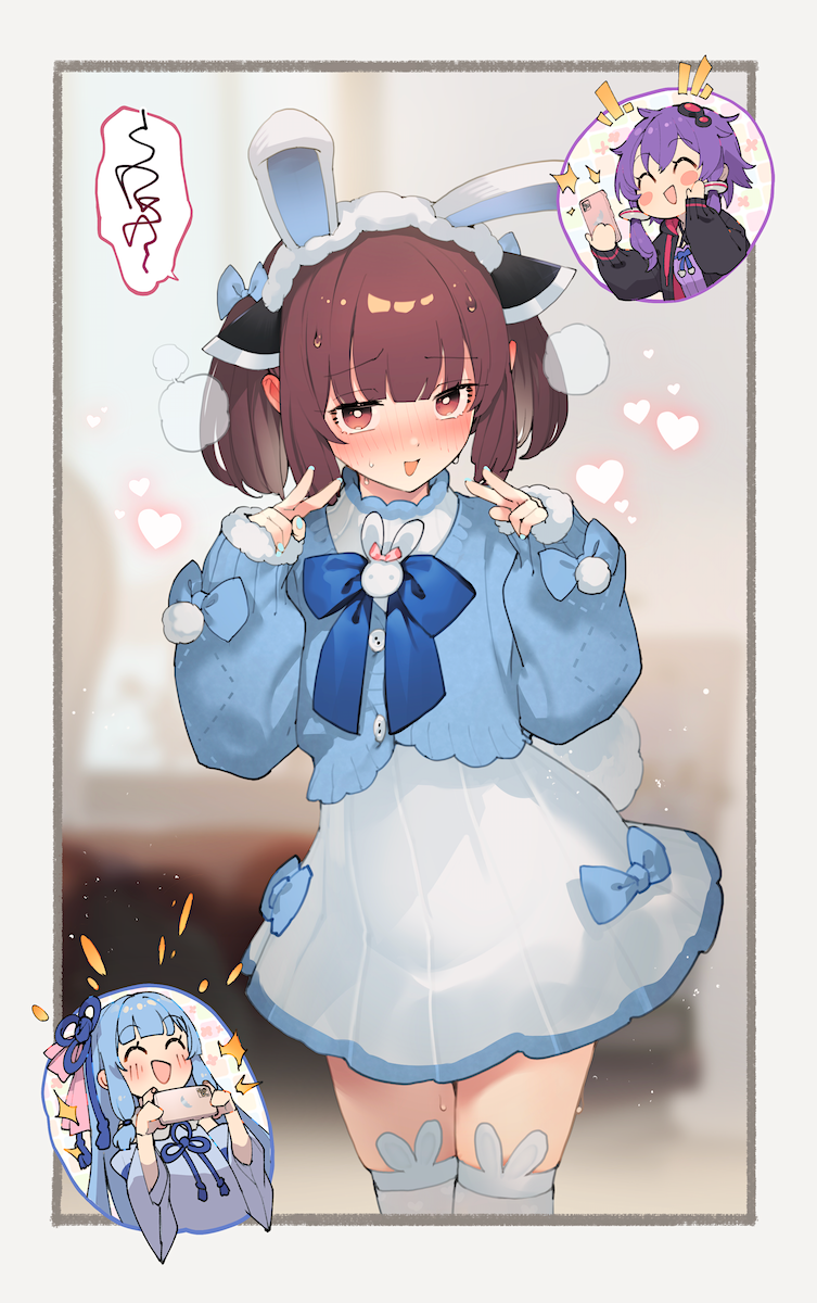 3girls ^_^ animal_ears black_hoodie blade blue_bow blue_bowtie blue_cardigan blue_dress blue_hair blue_sleeves blunt_bangs blurry blurry_background blush blush_stickers border bow bowtie breath brown_eyes brown_hair cardigan cellphone chibi chibi_inset closed_eyes cowboy_shot criss-cross_halter crossed_bangs detached_sleeves double_v dress ear_blush embarrassed fake_animal_ears fake_tail flower_knot fur-trimmed_sleeves fur_trim furrowed_brow hair_bow hair_ribbon halterneck headgear heart highres holding holding_phone hood hoodie kotonoha_aoi long_hair looking_at_viewer medium_hair multiple_girls open_clothes open_hoodie open_mouth phone pink_ribbon pom_pom_(clothes) purple_dress purple_hair rabbit_ears rabbit_tail raised_eyebrows ribbon shirinda_fureiru short_hair_with_long_locks short_twintails sidelocks sleeves_past_wrists smartphone smile solo_focus spoken_squiggle squiggle sweat tail taking_picture thighhighs touhoku_kiritan twintails upper_body v voiceroid white_border white_dress white_thighhighs wide_sleeves yuzuki_yukari zettai_ryouiki