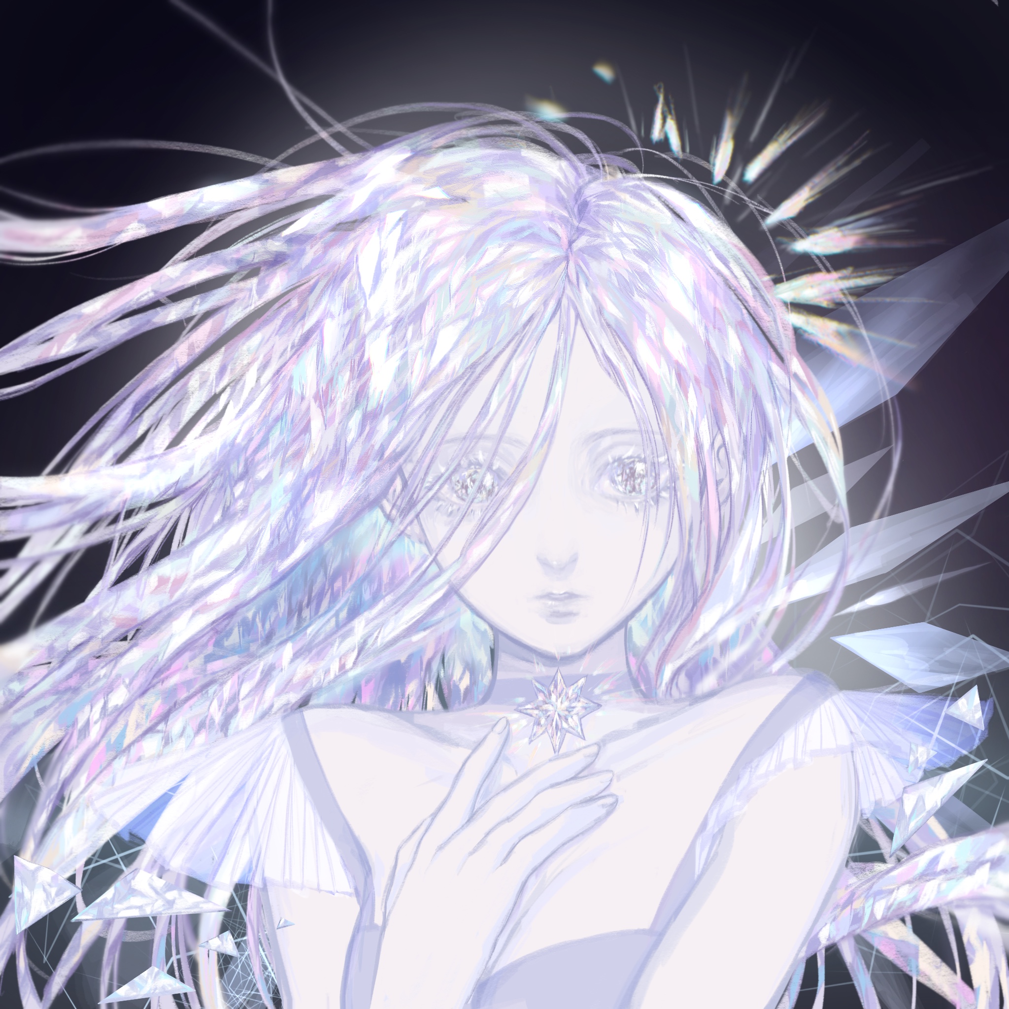 1girl choker colored_skin diamond_(gemstone) floating_hair gem hand_on_own_chest highres iridescent long_hair looking_at_viewer multicolored_eyes multicolored_hair original pale_color personification reicbury see-through_clothes see-through_sleeves solo straight-on upper_body white_skin wind