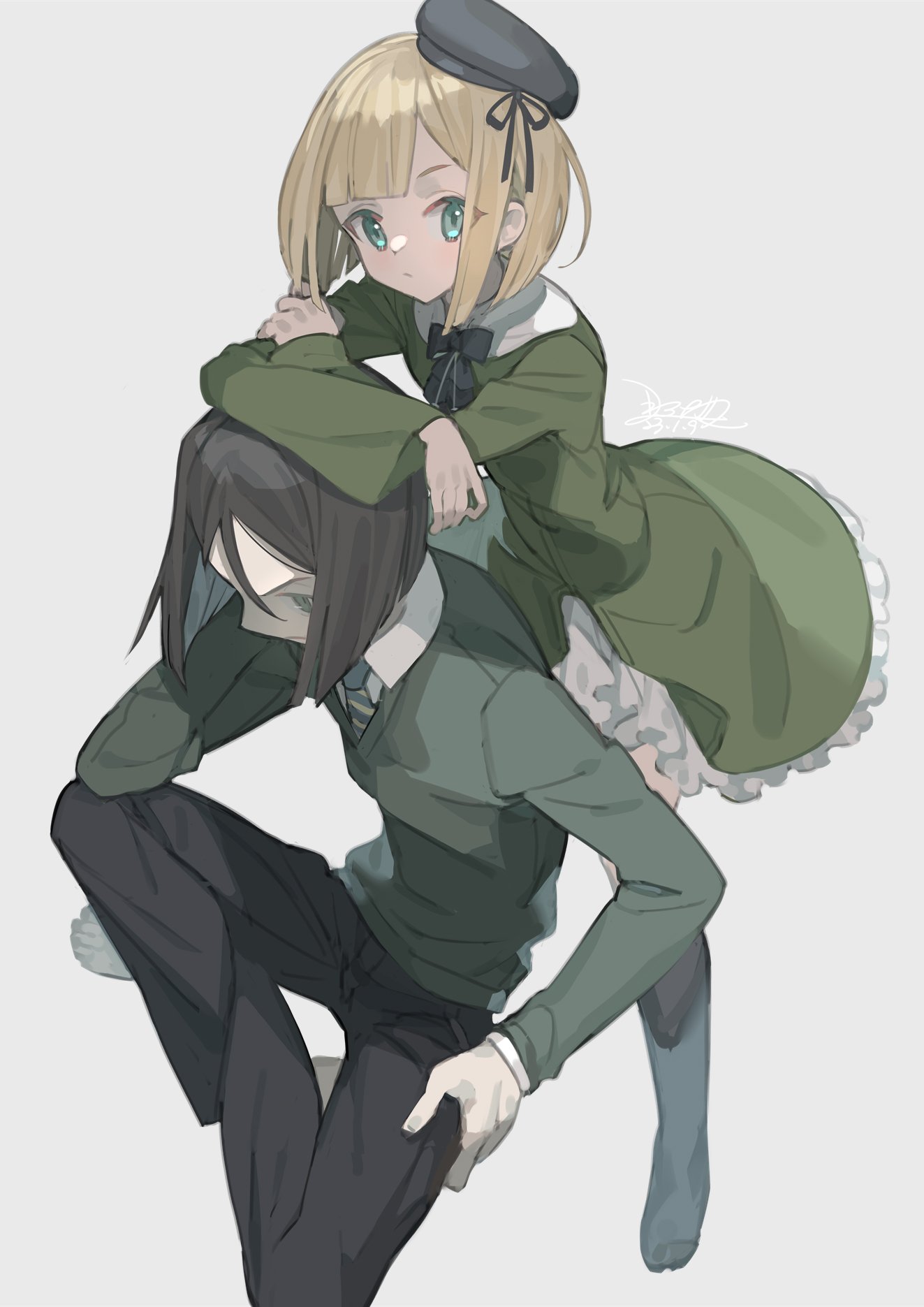 1boy 1girl :/ black_bow black_bowtie black_headwear black_pants black_socks blonde_hair blunt_bangs bow bowtie brown_hair collared_shirt dress fate/grand_order fate_(series) frilled_dress frills green_dress green_eyes green_sweater grey_background hair_between_eyes highres indian_style kneehighs long_sleeves looking_at_viewer lord_el-melloi_ii_case_files medium_hair nao_(syn_eaa) necktie pants reines_el-melloi_archisorte reines_el-melloi_archisorte_(young) shirt short_hair simple_background sitting socks striped_clothes striped_necktie sweater waver_velvet white_shirt