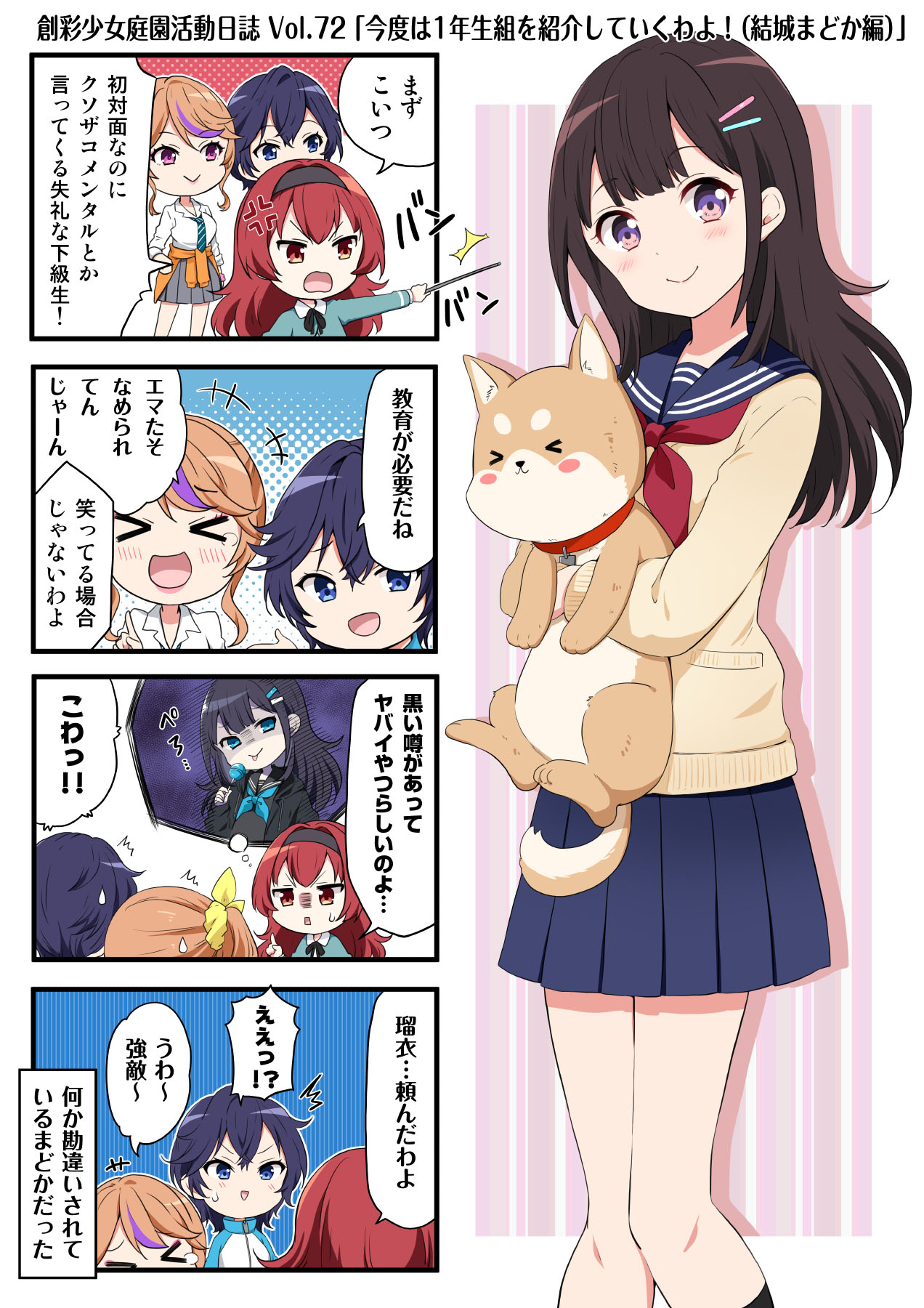 >_< 4girls anger_vein animal aqua_eyes black_jacket black_shirt black_socks blue_eyes blue_hair blue_jacket blue_sailor_collar blue_skirt blush bow brown_hair candy check_translation clothes_around_waist collared_shirt comic dark_persona dog food green_jacket green_necktie grey_skirt hair_bow hair_ornament hairband hairclip highres holding holding_animal holding_candy holding_dog holding_food holding_lollipop holding_pointer ichijo_seira index_finger_raised jacket koishikawa_emma laughing lollipop long_hair long_sleeves looking_at_viewer motion_lines multiple_girls neck_ribbon neckerchief necktie notice_lines official_art open_mouth orange_hair orange_sweater pale_skin partially_translated pleated_skirt pointer purple_eyes ragho_no_erika red_eyes red_hair red_neckerchief ribbon sailor_collar saotome_rui school_uniform scrunchie shirt short_hair skirt smile socks sousai_shoujo_teien speech_bubble sweatdrop sweater sweater_around_waist tan_sweater thighs thought_bubble tongue tongue_out track_jacket translation_request white_shirt wrist_scrunchie yellow_bow yuki_madoka