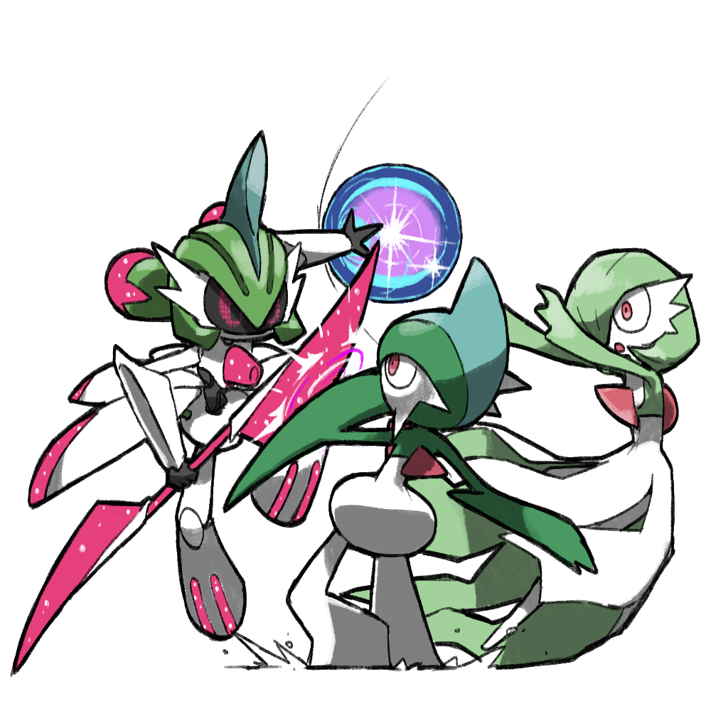 arm_blade blacknirrow clash colored_skin double_blade energy_ball fighting gallade gardevoir gen_3_pokemon gen_4_pokemon green_hair iron_valiant joints multicolored_skin nintendo no_feet no_mouth pixel_eyes pokemon pokemon_(creature) red_eyes robot_joints simple_background skirt sword_clash two-tone_skin weapon white_background