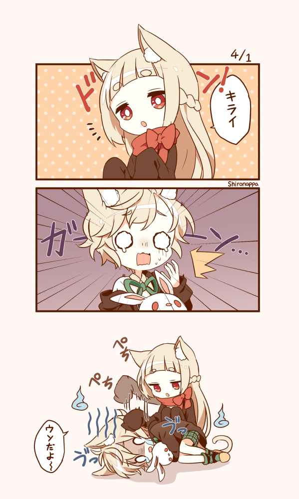1boy 1girl 3koma animal_ear_fluff animal_ears april_fools bird blunt_bangs bow braid cat_boy cat_ears cat_girl cat_tail comic dated depressed fetal_position french_braid green_ribbon green_shorts green_socks long_sleeves neck_ribbon open_mouth original plaid_clothes plaid_shorts red_bow red_scarf ribbon scarf shironappa shorts sleeves_past_fingers sleeves_past_wrists slippers socks speech_bubble striped_clothes striped_socks stuffed_animal stuffed_rabbit stuffed_toy tail tears translated wavy_eyes yuruneko_danshi_(shironappa) yuruneko_joshi_(shironappa)