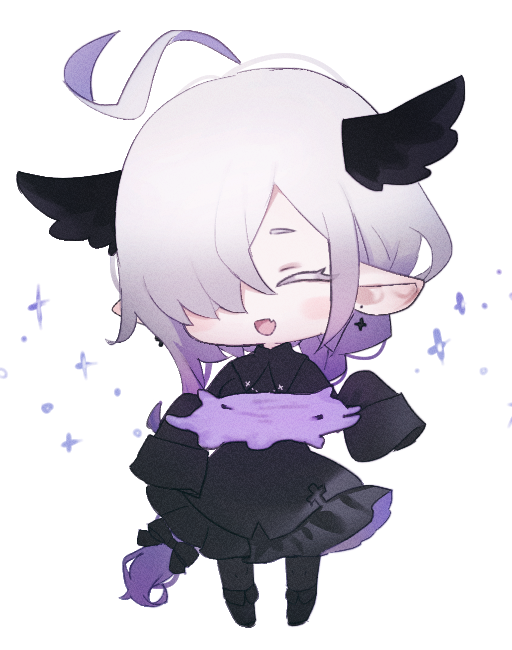 1girl :d ahoge animal_ears black_dress black_pantyhose blush braid chibi closed_eyes dress earrings facing_viewer gradient_hair grey_hair hair_over_one_eye head_wings jewelry long_hair long_sleeves migihidari_(puwako) multicolored_hair one_eye_covered open_mouth original pantyhose purple_hair rapute_(migihidari) sleeves_past_fingers sleeves_past_wrists smile solo very_long_hair wings