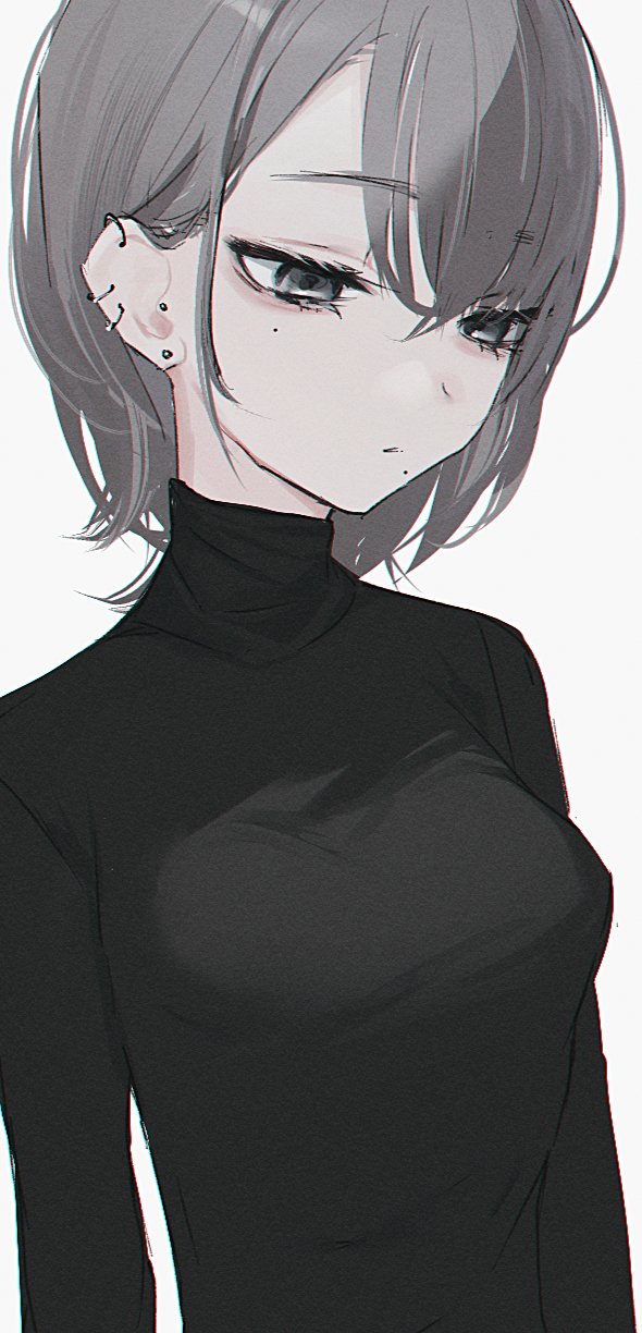 1girl black_eyes black_sweater closed_mouth ear_piercing earrings grey_hair highres jewelry long_sleeves looking_down medium_hair migihidari_(puwako) original piercing simple_background solo stud_earrings sweater white_background