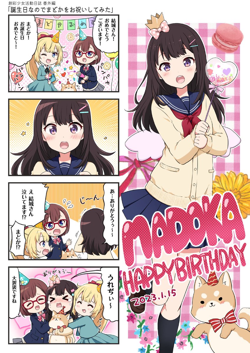 >_< 3girls animal asymmetrical_bangs balloon banner birthday_party black_ribbon black_socks blazer blonde_hair blue_eyes blue_jacket blue_sailor_collar blue_skirt blush bow bowtie brown_footwear brown_hair character_name check_translation closed_eyes collared_shirt comic crown crying dog emphasis_lines flower flying_sweatdrops food gingham_background green_jacket green_skirt grey_skirt hair_bow hair_ornament hairclip happy_birthday hat heart heart_balloon highres holding holding_animal holding_balloon holding_dog jacket loafers long_hair long_sleeves macaron mini_crown multiple_girls neck_ribbon neckerchief official_art one_eye_closed open_mouth partially_translated party_hat party_popper pleated_skirt ponytail purple_eyes ragho_no_erika red_bow red_bowtie red_neckerchief ribbon saeki_ritsuka sailor_collar school_uniform shirt shoes short_hair skirt socks sousai_shoujo_teien star_(symbol) striped_bow striped_bowtie striped_clothes takanashi_koyomi tan_sweater thighs translation_request white_shirt wings yuki_madoka