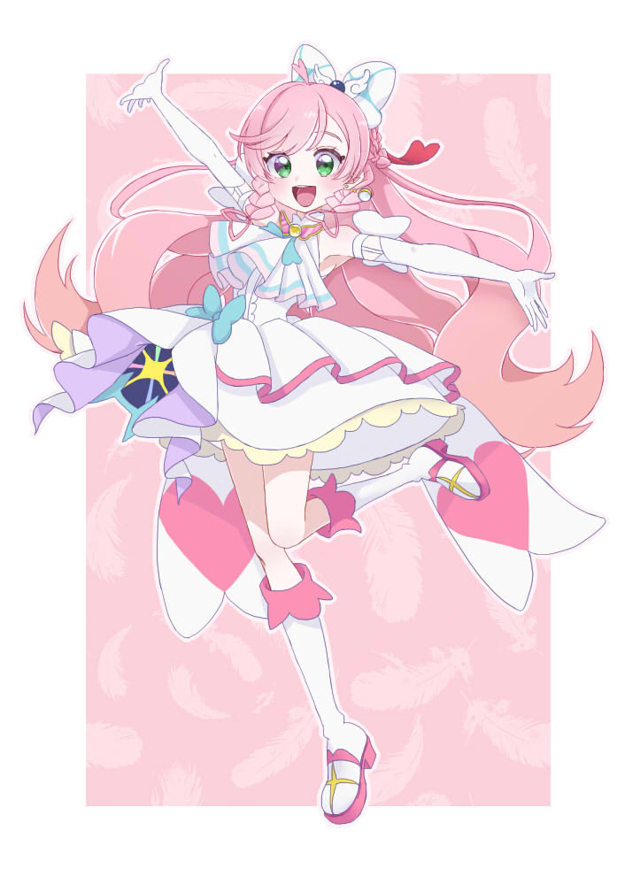 1girl ahoge ascot blue_bow boots bow cacao_(99chocolove99) commentary cure_prism dress earrings elbow_gloves full_body glove_bow gloves green_eyes hirogaru_sky!_precure jewelry long_hair magical_girl nijigaoka_mashiro open_mouth pink_hair precure smile solo standing standing_on_one_leg white_ascot white_boots white_bow white_dress white_gloves