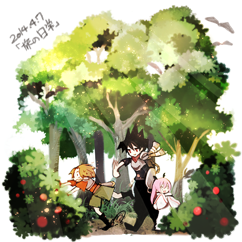1girl 2boys alba_(senyuu) armor bird black_hair brown_hair dextral green_shorts leaf leaf_on_head long_hair lowres multiple_boys pink_hair red_eyes ross_(senyuu) ruki_(senyuu) scarf sen'yuu. shorts tree