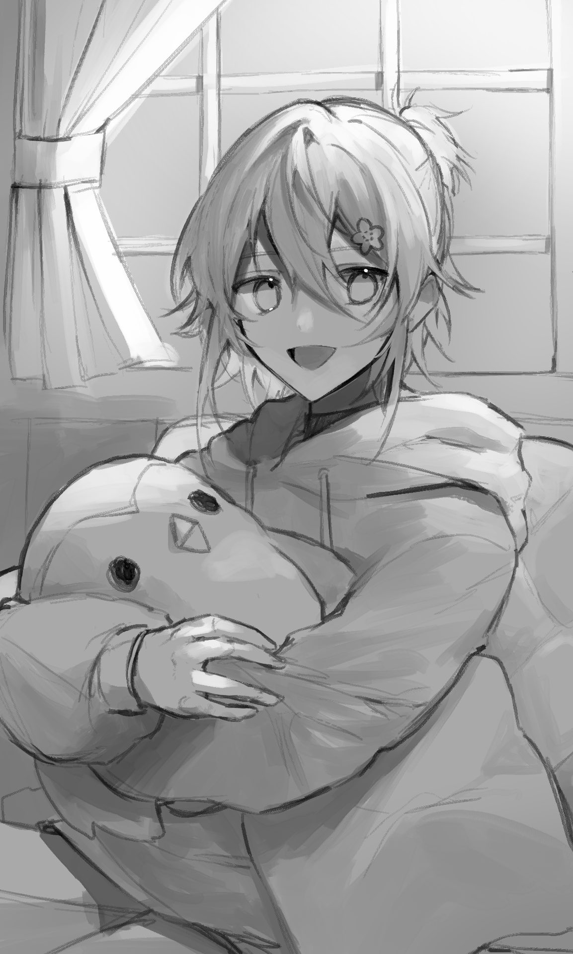 1boy :d commentary couch cowboy_shot curtains cushion drawstring flower greyscale hair_between_eyes hair_flower hair_ornament hairclip half_updo hanasaki_miyabi highres holding holding_stuffed_toy holostars hood hood_down hoodie kyokyo726 kyomu_suzume looking_at_viewer male_focus medium_hair monochrome hugging_object open_mouth pants sitting sketch smile solo stuffed_animal stuffed_bird stuffed_toy virtual_youtuber window