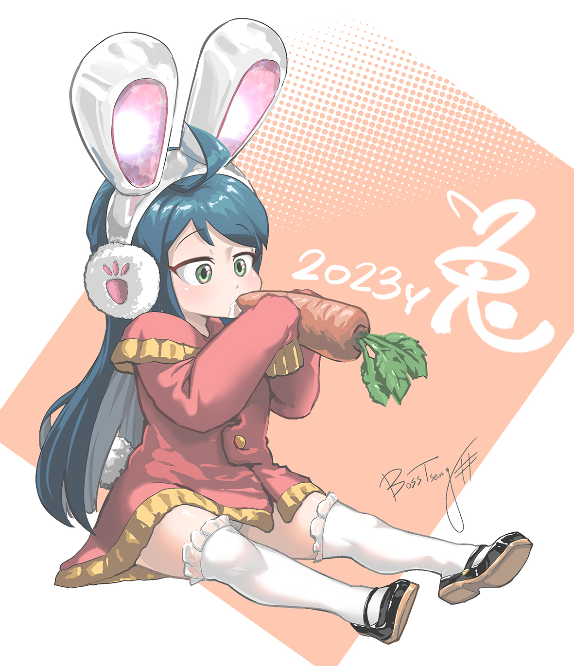 1girl animal_ears blue_hair bosstseng chinese_zodiac commentary_request dress drooling earmuffs fake_animal_ears fake_tail full_body green_eyes halftone halftone_background highres long_hair natsuki_(bosstseng) new_year original paw_print petite rabbit_earmuffs rabbit_ears rabbit_tail red_dress short_dress signature sitting solo tail thighhighs year_of_the_rabbit